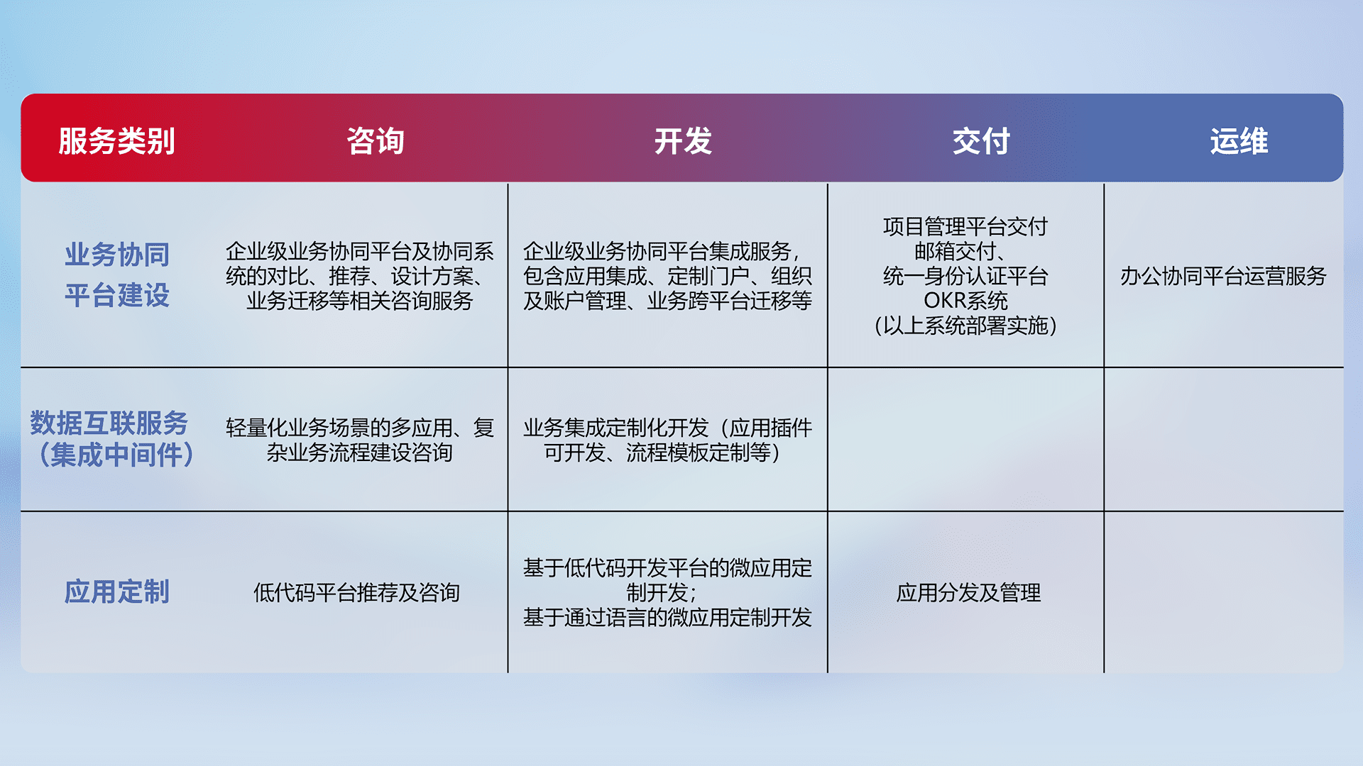 针对钉钉、、企微、、、IDaas等平台级产品提供产品的规划、、、、方案、、、交付、、、、定制化开发等服务,,实现如统一协同办公、、、、智能客户服务、、混合会议管理、、智能数据查询、、、、等业务场景,,,实现数字化转型。。。。