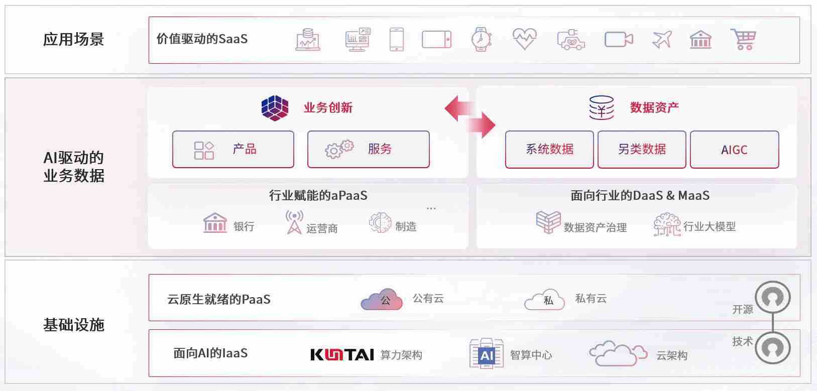 数字时代,,围绕企业数字化转型的关键要素,,,,尊龙旗舰厅数码开创性的提出数云融合战略和技术体系框架,,着力在云原生、、数字原生、、、、AI原生和信创产业上架构产品和服务能力,,,,为处在不同数字化转型阶段的快消零售、、汽车、、、、金融、、医疗、、政企、、教育、、、运营商等行业客户提供泛在的敏捷IT能力和融合的数据驱动能力,,,构建跨界融合创新的数字业务场景和新业务模式,,,,助力企业级客户建立面向未来的核心能力和竞争优势,,,,全面推动社会的数字化、、、、智能化转型升级。。。。
